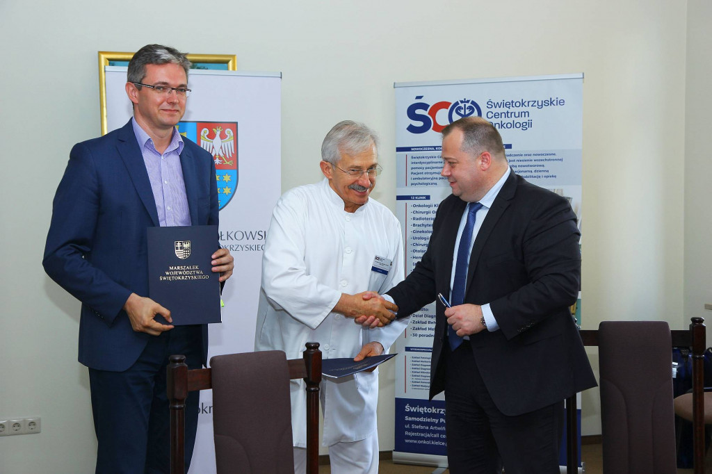 Marszałek Adam Jarubas, członek Zarządu Województwa Marek Szczepanik i prof. Stanisław Góźdź podpisali umowę na dofinansowanie projektu pn. „Zakup dla Świętokrzyskiego Centrum Onkologii sprzętu medycznego, niezbędnego z punktu widzenia udzielania świadczeń medycznych”. Wartość całkowita zadania to ponad 25 mln zł, z czego dofinansowanie z RPO WŚ to 20 mln zł. Projekt zostanie zrealizowany do końca stycznia 2019 roku. Zakup urządzeń przyczyni się do wzrostu efektywności i dostępności leczenia onkologicznego.