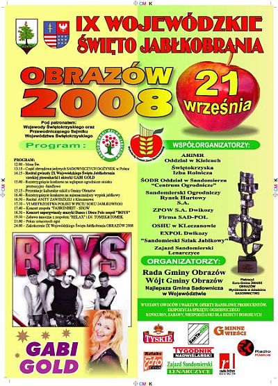 Dzierżący palmę pierwszeństwa owoc doczekał się również swojego święta. W sadowniczym zagłębiu – gminie Obrazów od kilku lat organizowane jest “Święto Jabłkobrania”, reklamujące te smaczne i zdrowe owoce. W tym roku odbędzie się ono w niedzielę 21 września, a honorowy patronat nad tą imprezą objął przewodniczący Sejmiku Województwa Świętokrzyskiego Tadeusz Kowalczyk.