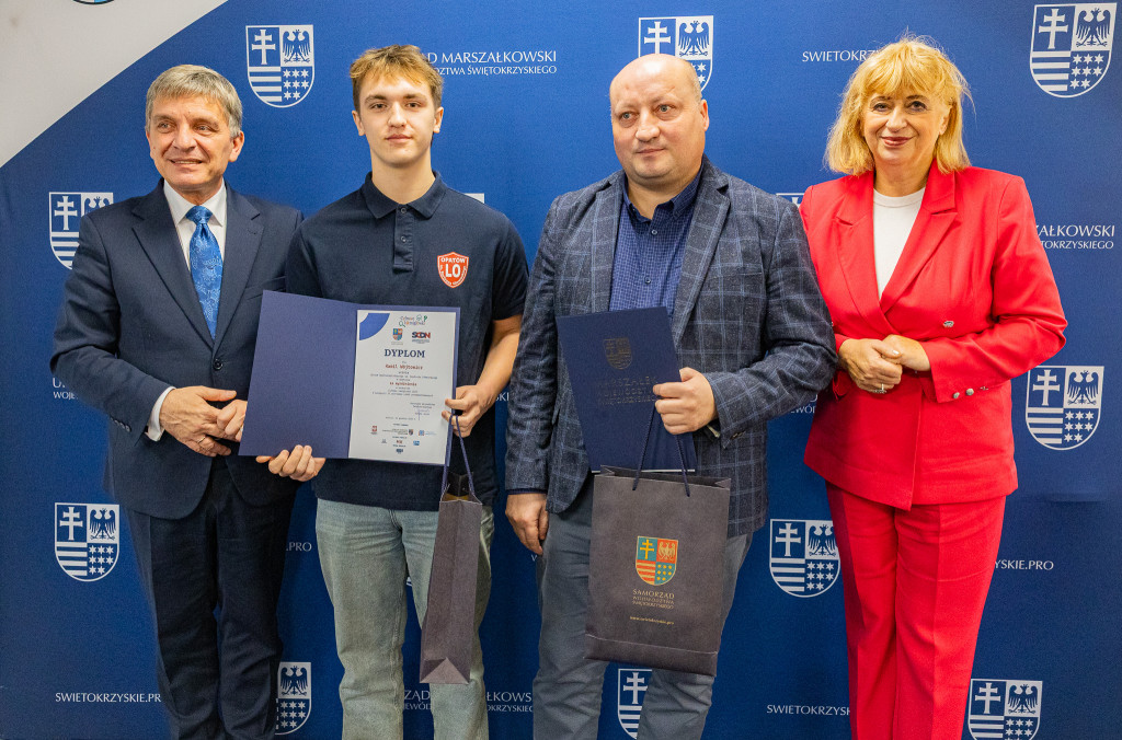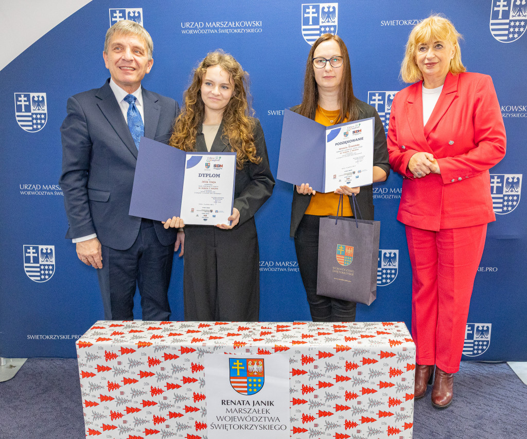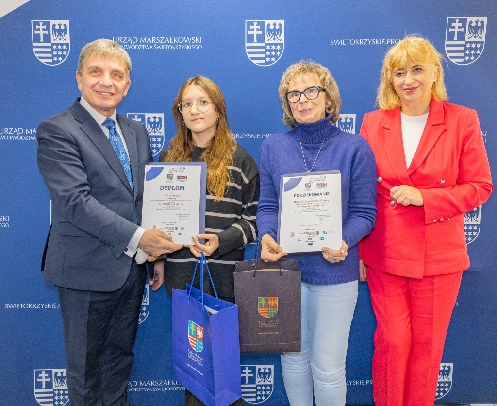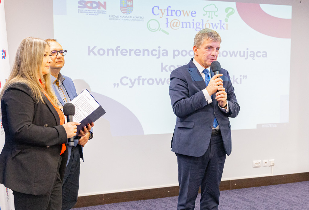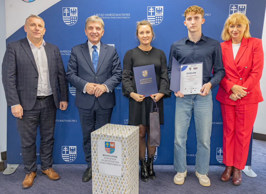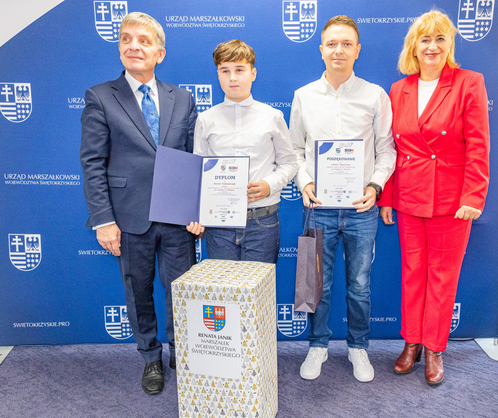 Andrzej Pruś – członek Zarządu Województwa Świętokrzyskiego oraz Małgorzata Łakomiec – dyrektor Świętokrzyskie Centrum Doskonalenia Nauczycieli wręczyli nagrody laureatom 8. edycji konkursu „Cyfrowe łamigłówki”, który od lat rozwija informatyczne pasje uczniów w całym regionie.