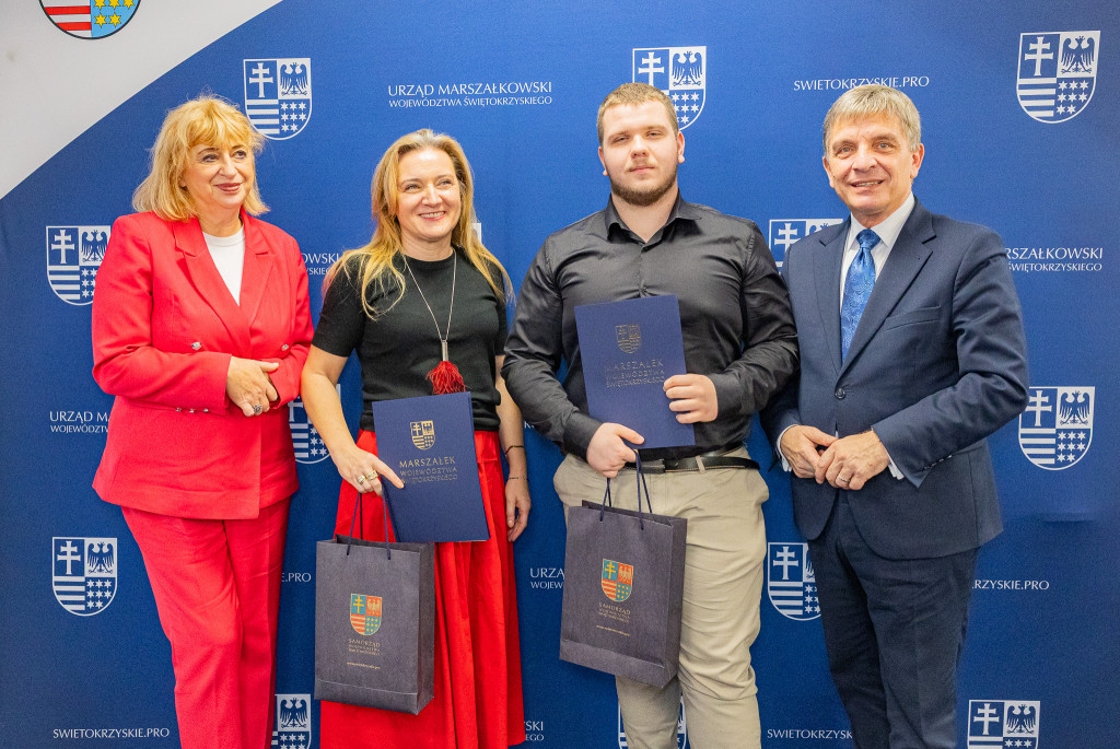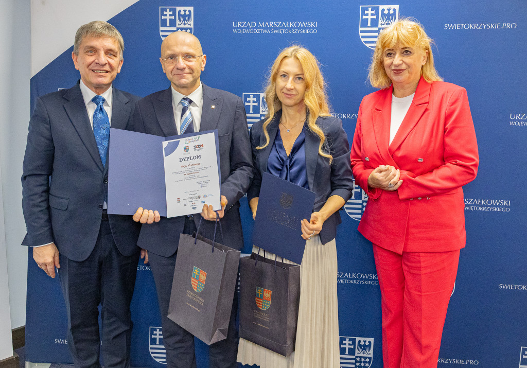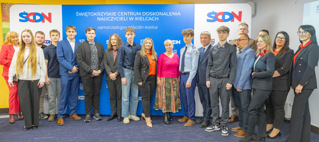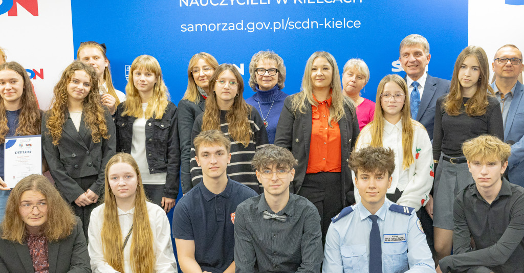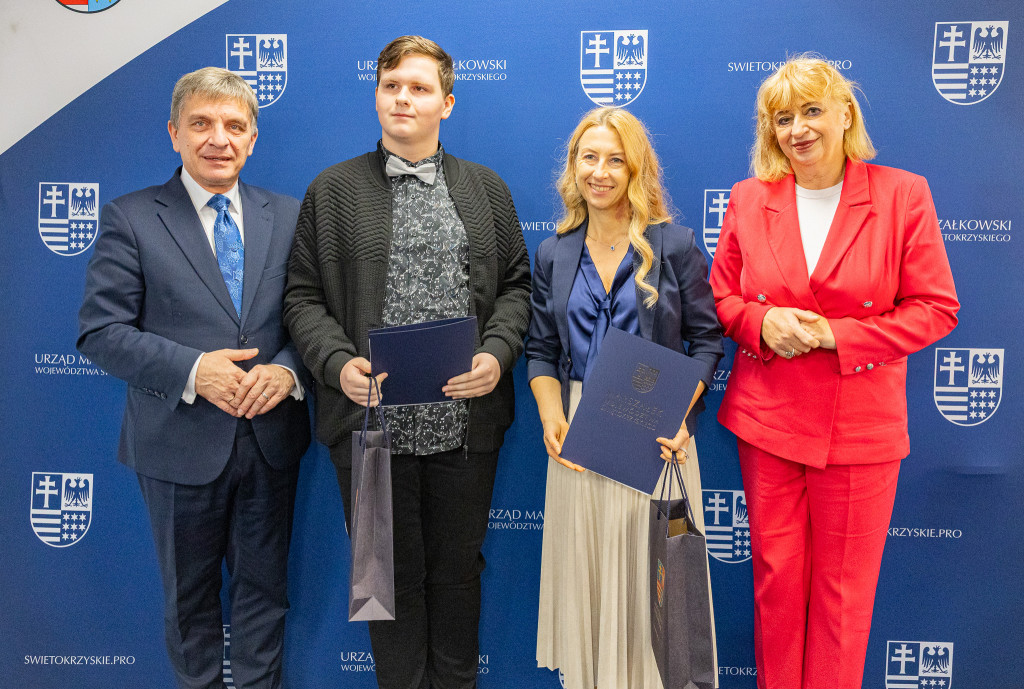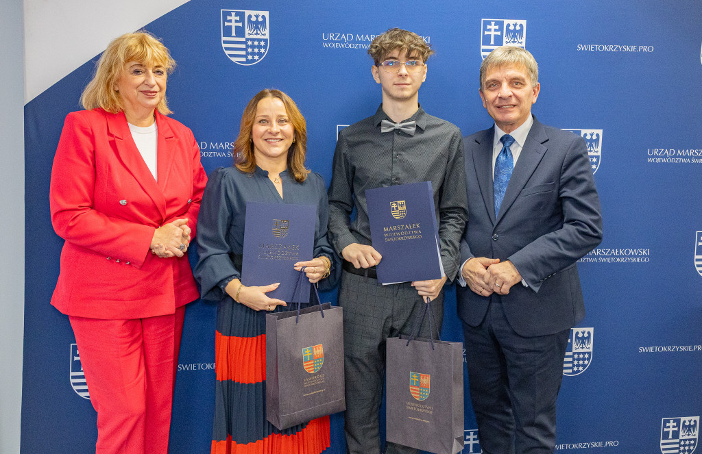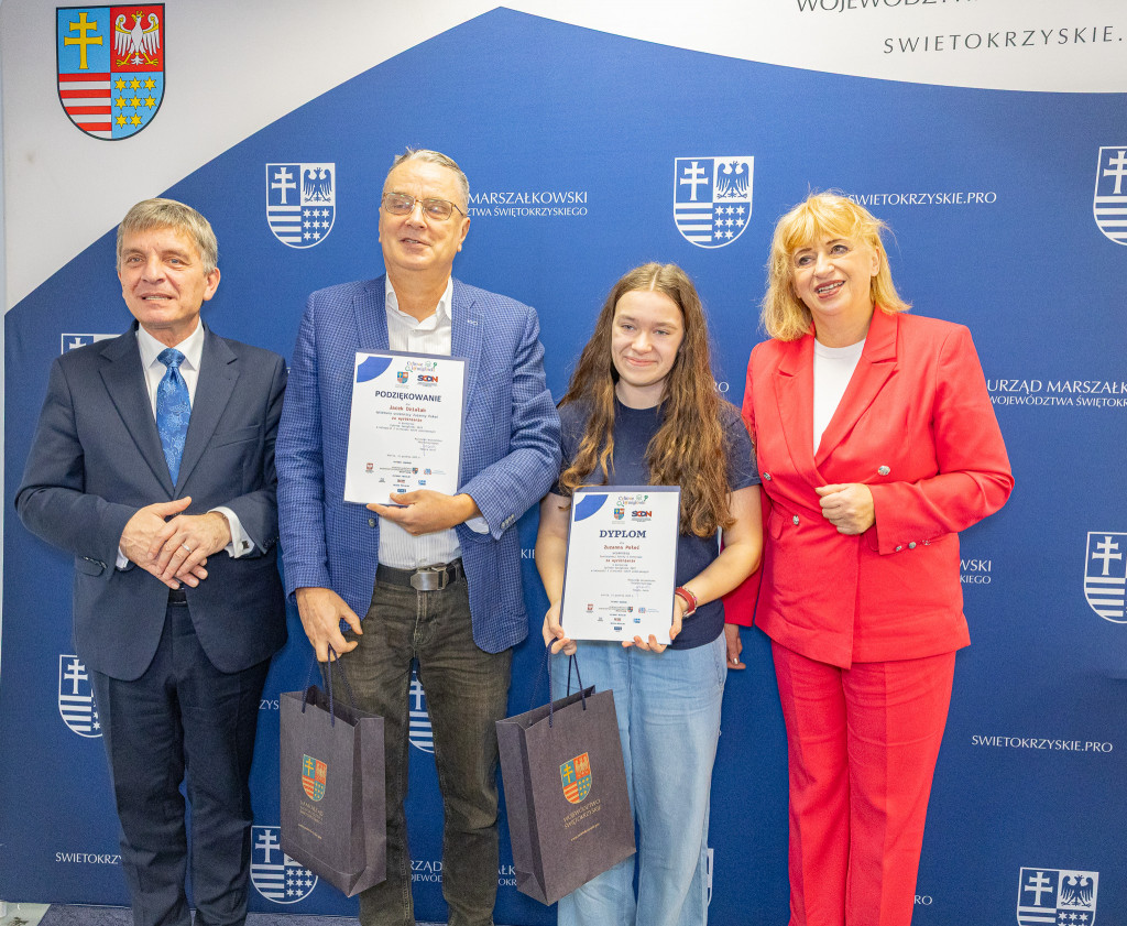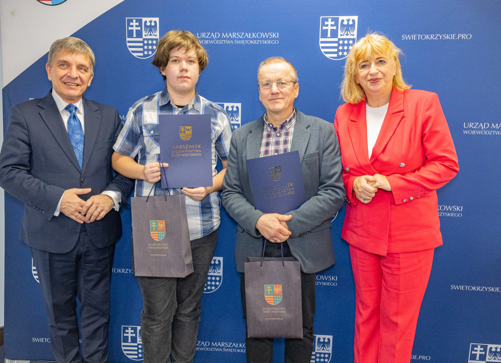 Andrzej Pruś – członek Zarządu Województwa Świętokrzyskiego oraz Małgorzata Łakomiec – dyrektor Świętokrzyskie Centrum Doskonalenia Nauczycieli wręczyli nagrody laureatom 8. edycji konkursu „Cyfrowe łamigłówki”, który od lat rozwija informatyczne pasje uczniów w całym regionie.