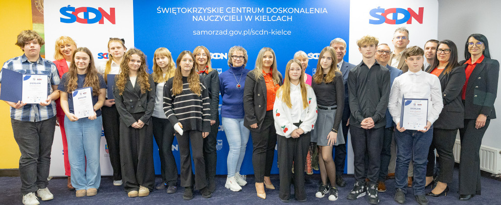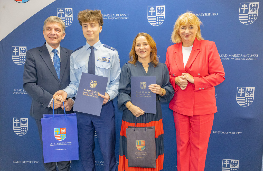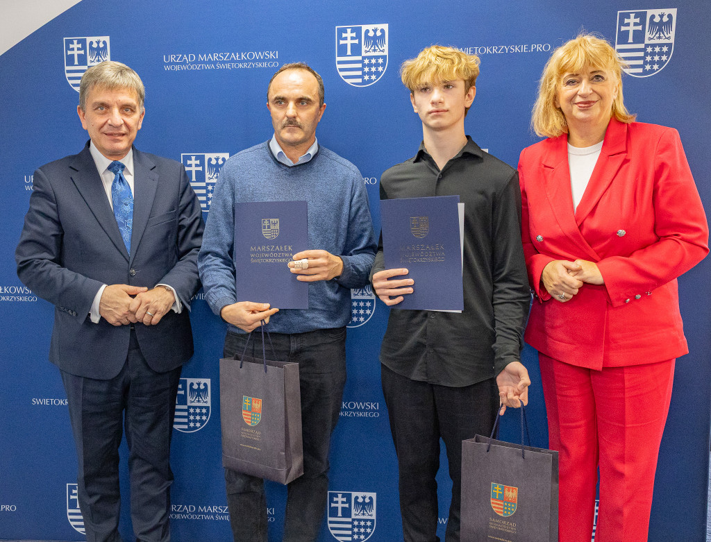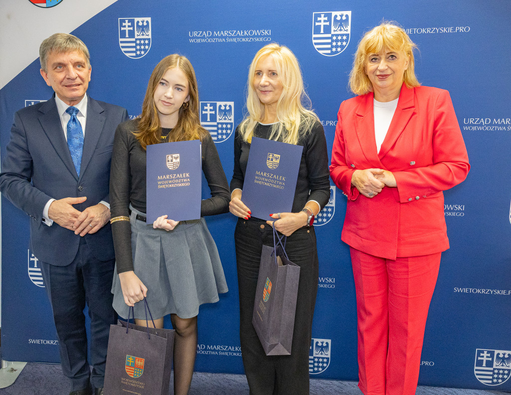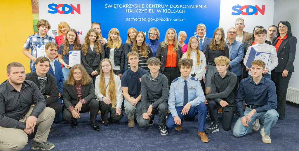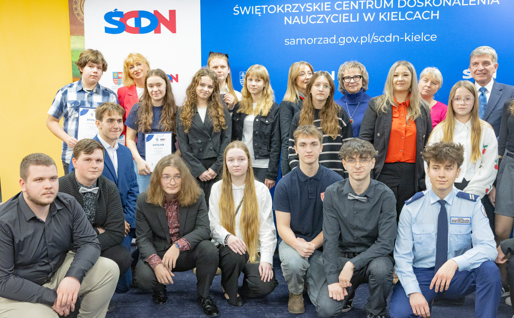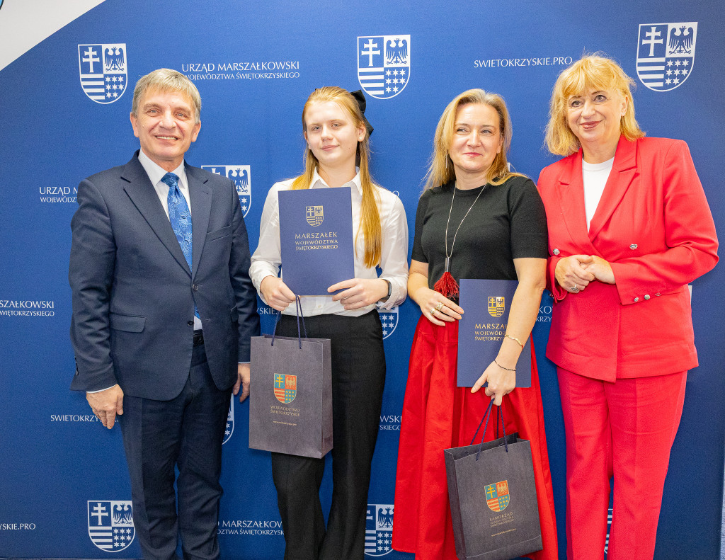 Andrzej Pruś – członek Zarządu Województwa Świętokrzyskiego oraz Małgorzata Łakomiec – dyrektor Świętokrzyskie Centrum Doskonalenia Nauczycieli wręczyli nagrody laureatom 8. edycji konkursu „Cyfrowe łamigłówki”, który od lat rozwija informatyczne pasje uczniów w całym regionie.