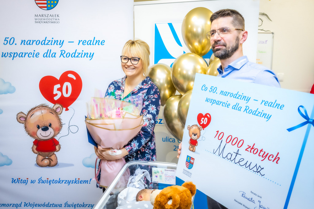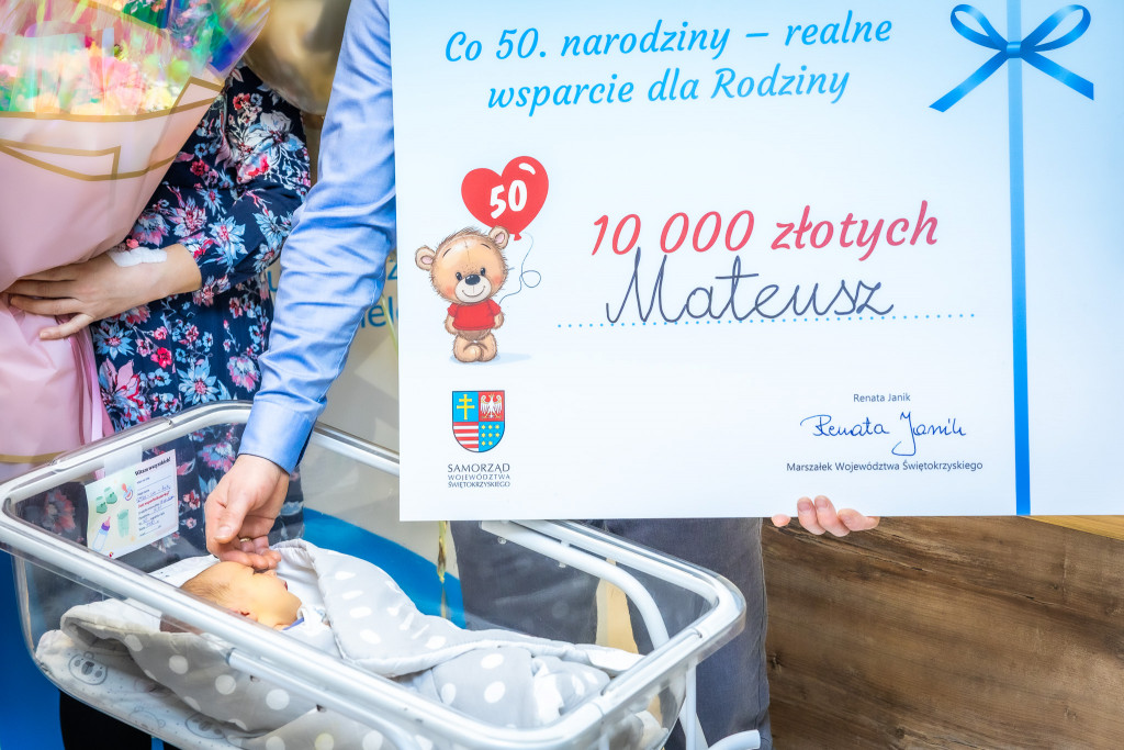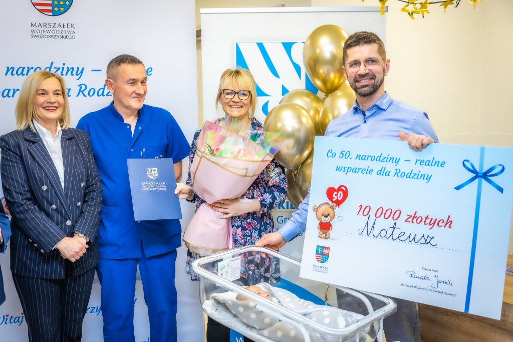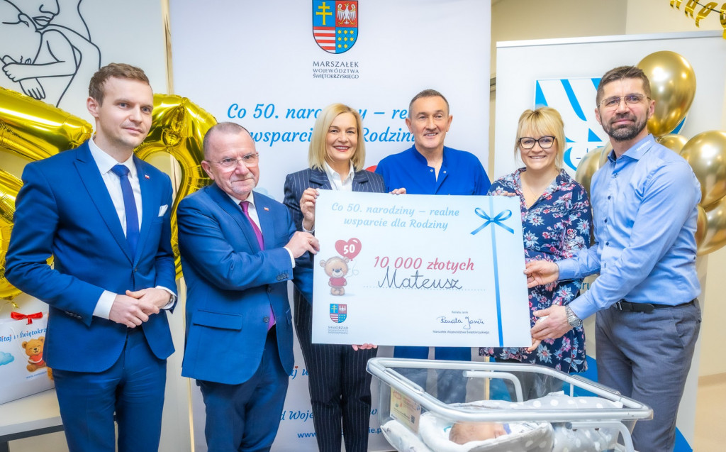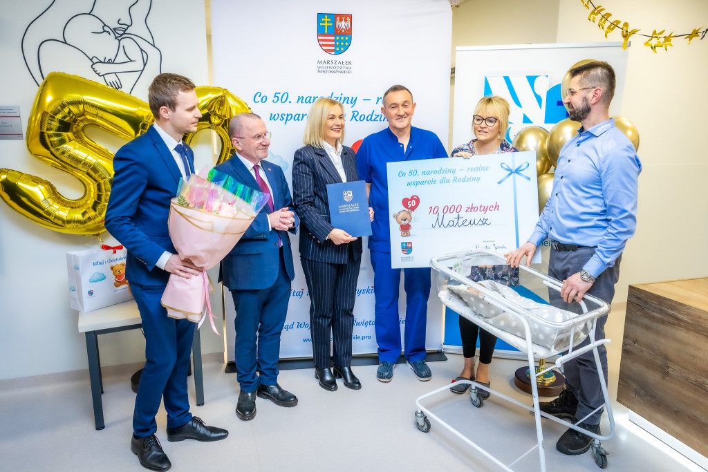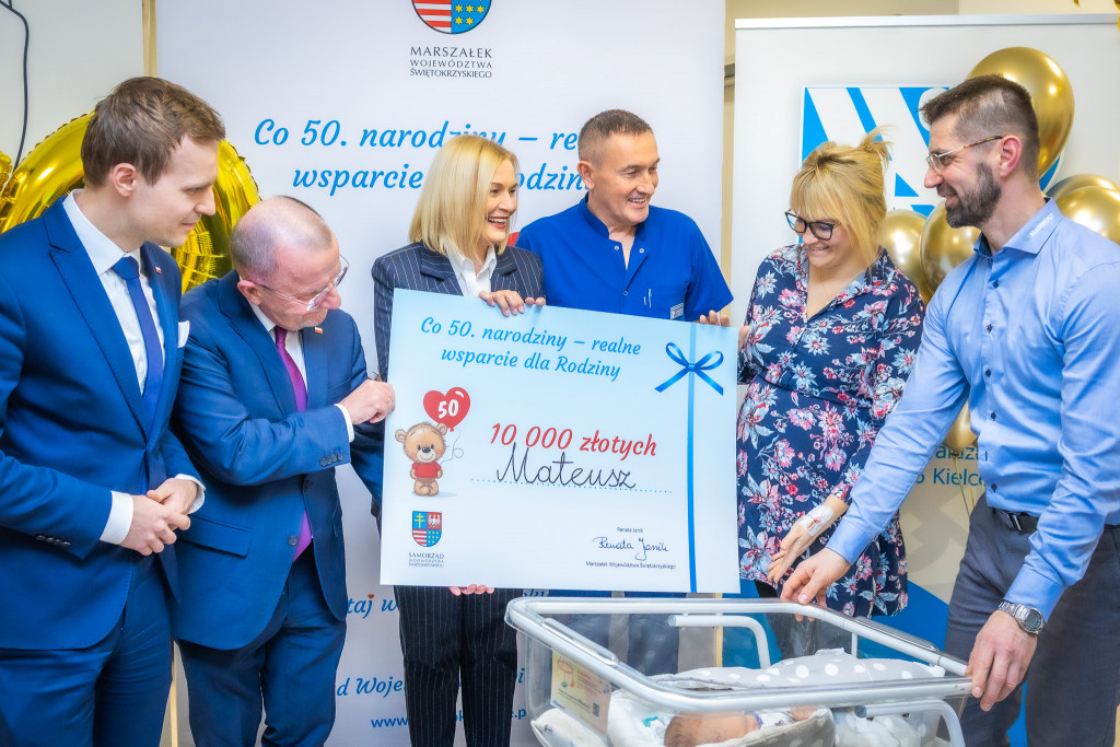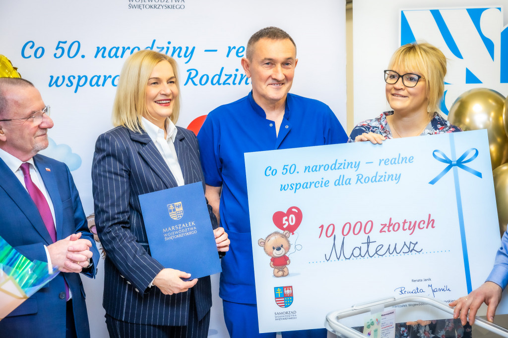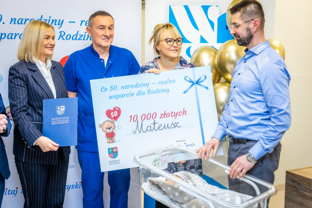 Dzisiaj na nowoczesnym bloku porodowym Wojewódzkiego Szpitala Zespolonego (WSzZ) w Kielcach odbyła się wyjątkowa uroczystość. Marszałek Renata Janik przekazała symboliczny czek oraz gratulacje rodzicom małego Mateusza. Chłopiec jest 50. dzieckiem urodzonym w tej placówce od początku tego roku.