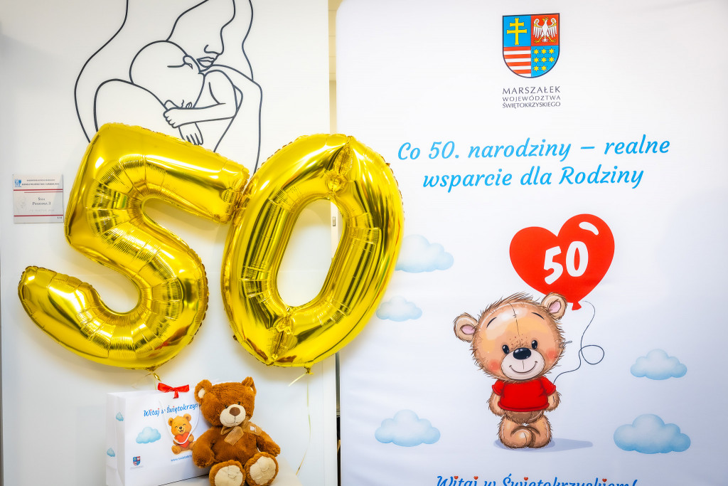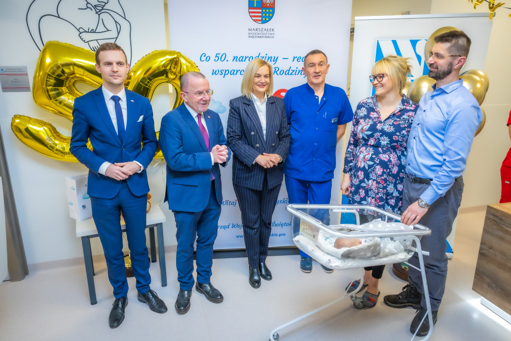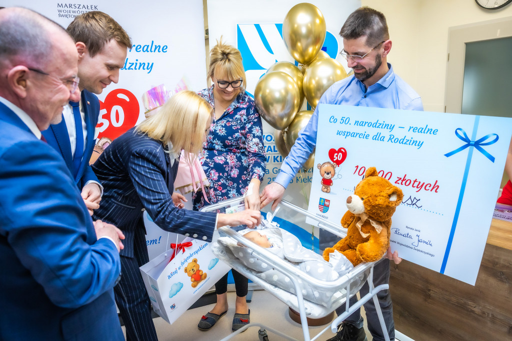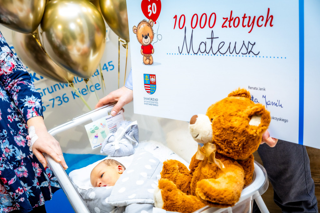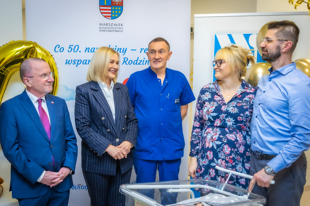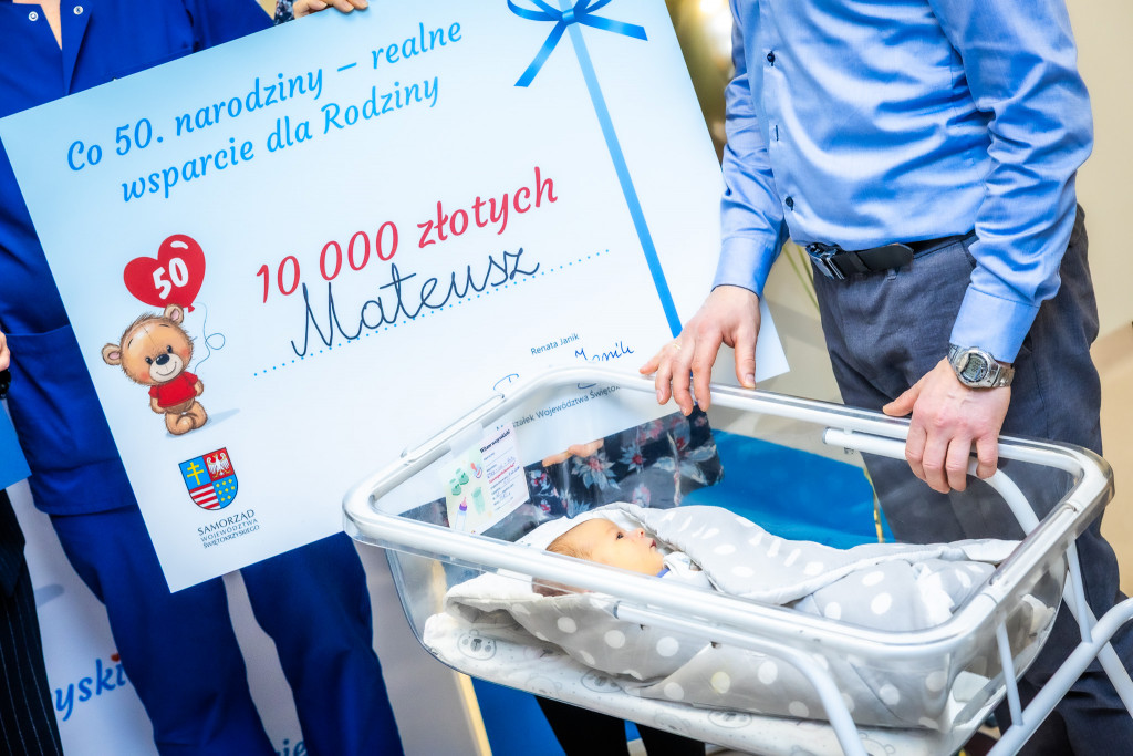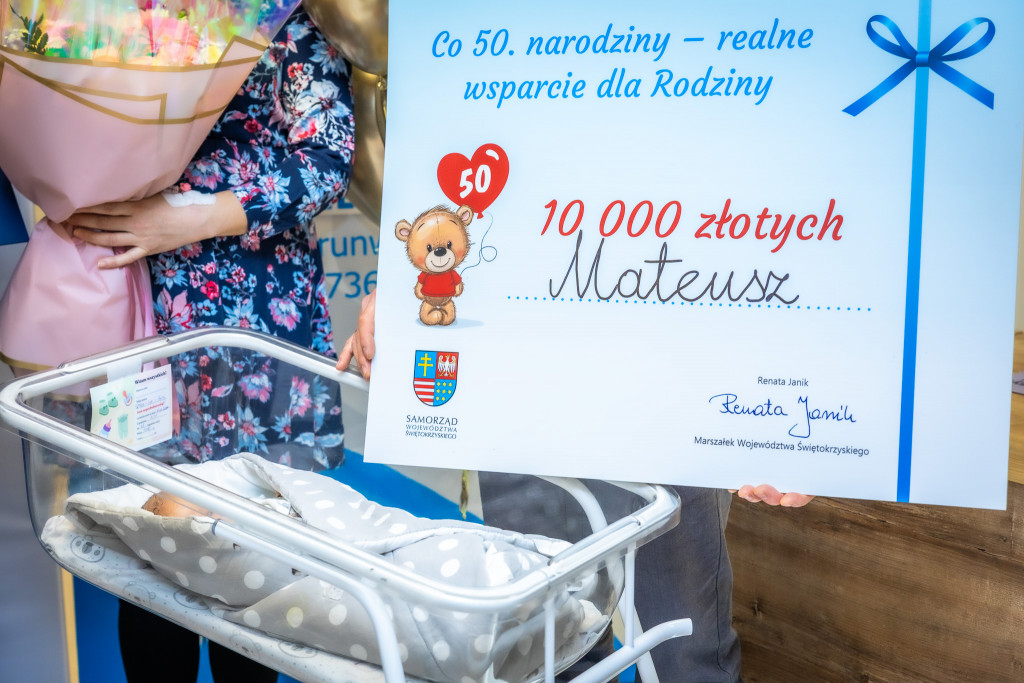 Dzisiaj na nowoczesnym bloku porodowym Wojewódzkiego Szpitala Zespolonego (WSzZ) w Kielcach odbyła się wyjątkowa uroczystość. Marszałek Renata Janik przekazała symboliczny czek oraz gratulacje rodzicom małego Mateusza. Chłopiec jest 50. dzieckiem urodzonym w tej placówce od początku tego roku.