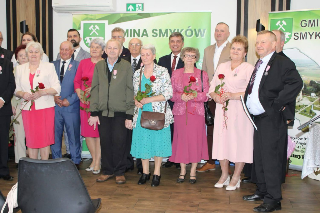 W imieniu Prezydenta, medale wręczył członek Zarządu Województwa Andrzej Pruś wraz z wójtem gminy Smyków Beatą Janiszewską, w asyście: starosty koneckiego Grzegorza Pieca, zastępcy starosty Karola Leśniaka, przewodniczącego Rady Dariusza Kucharskiego, ks. Dariusza Maciejczyka oraz kierownik Urzędu Stanu Cywilnego Pauliny Pawłowskiej. Jubilaci otrzymali również pamiątkowe dyplomy, kwiaty oraz upominki. Wzruszające chwile uświetniły liczne życzenia, płynące od przedstawicieli władz samorządowych, duchowieństwa oraz zgromadzonych rodzin.