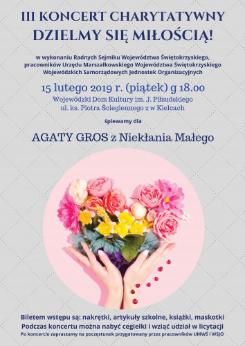 Będzie to już trzeci zimowy koncert charytatywny organizowany przez wolontariuszy Urzędu Marszałkowskiego Województwa Świętokrzyskiego. Wiele wskazuje na to, że mimo chłodu panującego na dworze, sala Wojewódzkiego Domu Kultury kipieć będzie od uczuć i pozytywnych emocji, bowiem tegoroczne wydarzenie, organizowane pod hasłem „Podzielmy się miłością”, dedykowane będzie właśnie temu gorącemu uczuciu. Podczas koncertu odbędzie się zbiórka pieniężna, która wesprze leczenie Agaty Gros z Niekłania Małego.