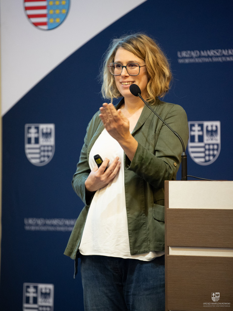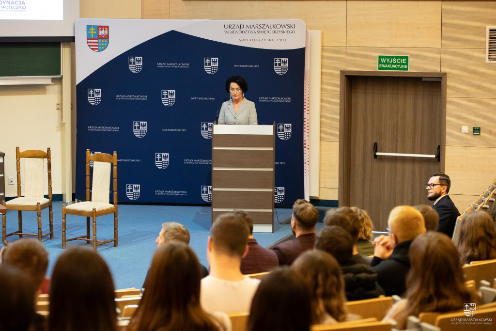 – To przedsięwzięcie, które dzisiaj realizujemy nie jest dla mnie, dla dyrektorów, czy nawet dla naszych gości, którzy przyjechali, by się dzisiaj z Wami spotkać i podzielić swoją wiedzą, doświadczeniem, swoimi sukcesami. To spotkanie jest dla Was, dla młodych. I przyznam szczerze, że ja jako marszałek, ale też Zarząd Województwa, Sejmik, już nie wiemy, co możemy zrobić, by młodych ludzi, studentów pobudzić, zachęcić do działania. Przed spotkaniem dziennikarze pytali mnie, co zrobić, by zachęcić młodych ludzi do pozostania w regionie? My to robimy – wzmacniamy nasze uczelnie, fundujemy stypendia, zachęcamy – jak na dzisiejszym spotkaniu – do tworzenia społecznych startupów… Ale mówię też, że – jak w tej znanej piosence – do tanga trzeba dwojga… Jeśli działania, które robimy będą odbierane przez puste ławki auli, to nic z tego nie będzie. Mamy bardzo dobre uczelnie, mamy pracę, od urzędów wszystkich szczebli zaczynając – wszędzie potrzeba dobrze wykwalifikowanych pracowników, którzy chcą pracować i chcą się rozwijać. Zarząd Województwa Świętokrzyskiego od lat robi wszystko, by stworzyć jak najlepsze warunki do rozwoju młodych ludzi, by zachęcić ich do związania swojej przyszłości z naszym regionem. Chcemy, aby – po zakończeniu studiów – w Świętokrzyskiem znaleźli Państwo swoje miejsce do zamieszkania i budowania kariery zawodowej. Ale do tego trzeba aktywności z Waszej strony –zwracała się do zgromadzonych w auli studentów marszałek Renata Janik. – Mamy dzisiaj wspaniałych gości, którzy powiedzą Wam, że jest nisza, w której można założyć własną działalność. Przecież wielu studentów zakłada firmy, będąc jeszcze studentami. Mamy taką niszę – obszar podmiotów ekonomii społecznej, które świetnie się rozwijają. Możecie pozyskać środki na rozwinięcie społecznych startupów. Macie dwa źródła – Kieleckie Park Technologiczny realizuje projekt może pozyskać do 600 tysięcy złotych, albo z Polskiej Agencji Rozwoju Przedsiębiorczości. Skorzystajcie z obecności naszych ekspertów i czerpcie od nich wiedzę.