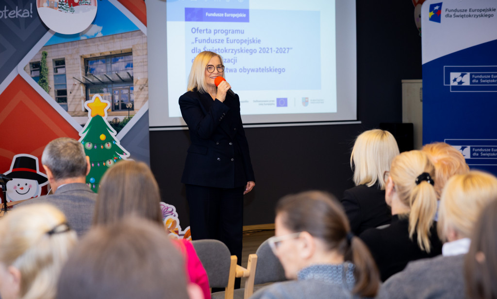 Blisko 100 osób – przedstawiciele świętokrzyskiego NGO – uczestniczyło w szkoleniu, zorganizowanym w siedzibie Wojewódzkiej Biblioteki Publicznej w Kielcach przez pracowników Departamentu Wdrażania Europejskiego Funduszu Społecznego Urzędu Marszałkowskiego Województwa Świętokrzyskiego i Fundację imienia Stefana Artwińskiego. Spotkanie miało na celu pomoc organizacjom pozarządowym z województwa świętokrzyskiego w prawidłowym przygotowaniu wniosków o dofinansowanie projektów w ramach Działania 9.6 FEŚ 2021-2027 pt. „Podnoszenie potencjału partnerów społecznych i organizacji społeczeństwa obywatelskiego”. Organizacje mogą składać wnioski o dofinansowania do końca stycznia br. Z uczestnikami szkolenia spotkała się marszałek Renata Janik. Obecni byli także Katarzyna Kubicka dyrektor Departamentu Wdrażania Europejskiego Funduszu Społecznego Urzędu Marszałkowskiego Województwa Świętokrzyskiego i jej zastępca Artur Potaczała.