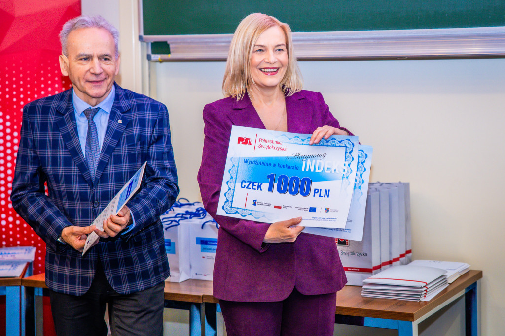 Na Politechnice Świętokrzyskiej odbyła się uroczysta Gala finałowa piątej edycji konkursu o Platynowy Indeks. W wydarzeniu, podczas którego nagrodzono najzdolniejszych uczniów z regionu, udział wzięła marszałek Renata Janik. To już trzecia edycja gali, która jest realizowana w ramach projektu „Dziś uczeń – jutro student”, finansowanego z programu regionalnego „Fundusze Europejskie dla Świętokrzyskiego 2021-2027”. Na Gali obecni byli także m.in. rektor Politechniki Świętokrzyskiej prof. Zbigniew Koruba oraz prorektor ds. studenckich i dydaktyki prof. Artur Maciąg.