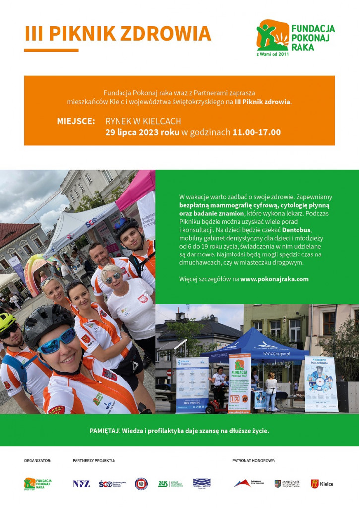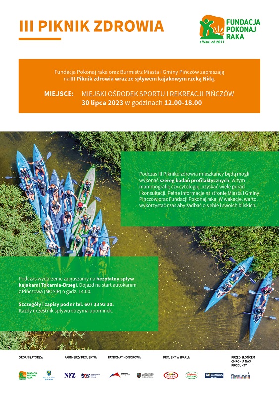 Na III Piknik Zdrowia zapraszają w dniach 29-30 lipca: Fundacja Pokonaj Raka i Burmistrz Miasta i Gminy Pińczów. Podczas dwudniowej imprezy, pełnej zdrowia i profilaktyki onkologicznej, dostępnych będzie wiele bezpłatnych badań i konsultacji dla dorosłych i dzieci. Patronat honorowy nad Piknikiem objął Andrzej Bętkowski, marszałek województwa świętokrzyskiego.