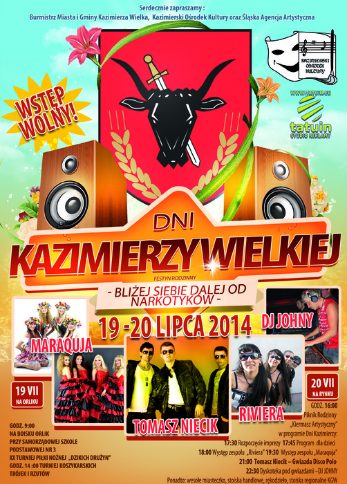 Program dla dzieci, występy zespołów „Riwiera” i „Marakuja”, zabawa z Tomaszem Niecikiem, gwiazdą disco polo oraz dyskoteka pod gwiazdami – to tylko niektóre z atrakcji, jakie odbędą się podczas Dni Kazimierzy Wielkiej. Impreza będzie przebiegać pod hasłem „Bliżej siebie dalej od narkotyków”.