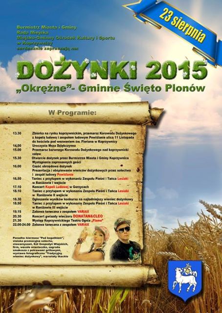 Występ zespołu Donatan&Cleo będzie główną atrakcją podczas Dożynek 2015 w Koprzywnicy. „Okrężne” – Gminne Święto Plonów rozpocznie o godzinie 13.30, przemarsz korowodu dożynkowego z rynku w Koprzywnicy do kościoła pw. św. Floriana, gdzie odbędzie się uroczysta msza dziękczynna.