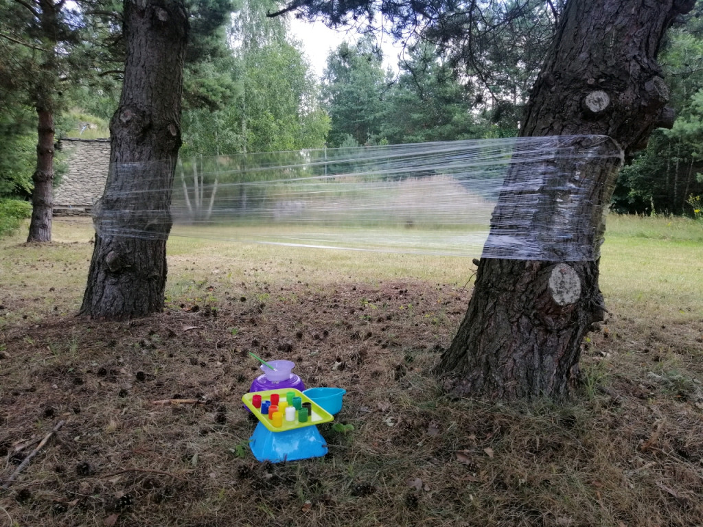 Zabawę zorganizowano w ogrodzie, ale nie zawsze jest to możliwe. Z doświadczenia wiemy, że aktywność ta sprawdza się również w mieszkaniu. Obwinięcie stołu folią, naprawdę daje radę.