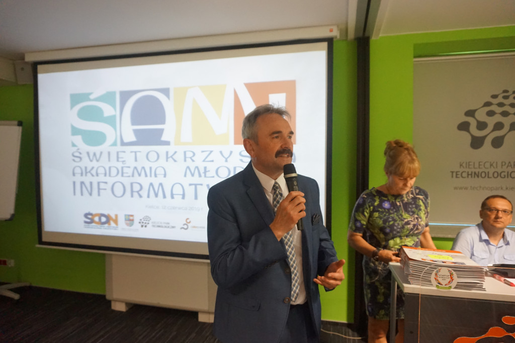 W środę, 12 czerwca w Kieleckim Parku Technologicznym odbył się finał trzeciej edycji konkursu „Z Panem Scratchem za pan brat”, a następnie podsumowanie Projektu “Świętokrzyska Akademia Młodych Informatyków” realizowanego przez Świętokrzyskie Centrum Doskonalenia Nauczycieli oraz Departament Cyfryzacji, Geodezji i Planowania Przestrzennego Urzędu Marszałkowskiego w Kielcach. Projekt objęty był patronatem Marszałka Województwa Świętokrzyskiego Andrzeja Bętkowskiego.