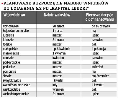 W harmonogramie przygotowanym przez Ministerstwo Rozwoju Regionalnego znajdują się dane dotyczące tzw. programów krajowych. Należą do nich: „Innowacyjna gospodarka”, „Infrastruktura i środowisko”, „Rozwój Polski wschodniej” i „Kapitał ludzki”. Ten ostatni program podzielony jest na tzw. komponent centralny i komponent regionalny. W harmonogramie zawarte są informacje zarówno o jednym, jak i drugim komponencie. Stąd np. osoby, które chcą rozpocząć własną działalność gospodarczą, mogą sprawdzić, kiedy planowane jest uruchomienie działania 6.2 w ich województwach. To właśnie ono w głównej mierze ma wspierać rozwój przedsiębiorczości i ułatwiać tworzenie nowych firm.
