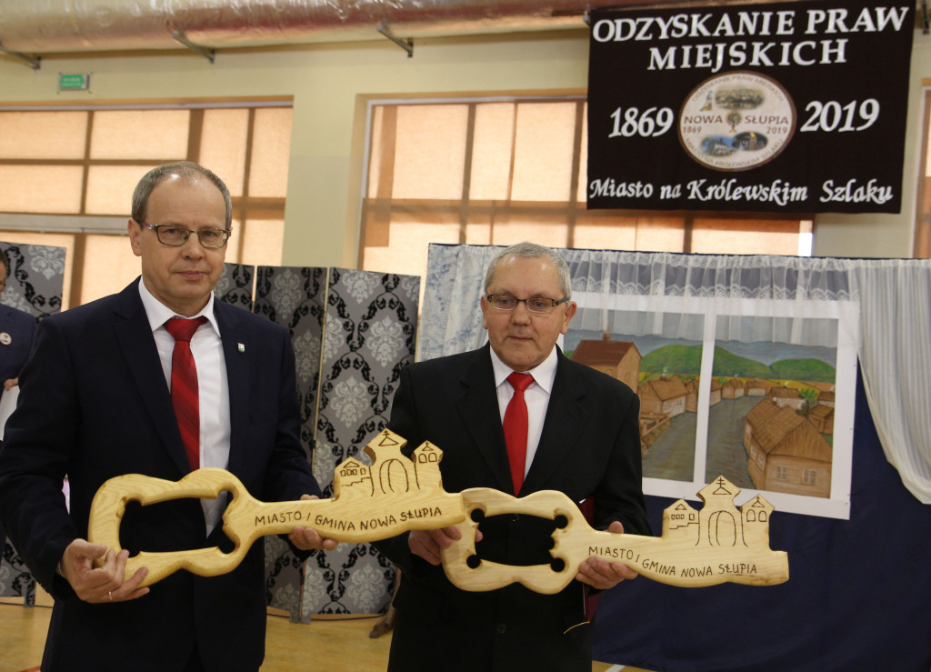 Symboliczne klucze do bram miasta, burmistrz Andrzej Gąsior otrzymał z rąk zarządu Towarzystwa Przyjaciół Nowej Słupi, z inicjatywy którego został złożony wniosek w sprawie przywrócenia praw miejskich dla miejscowości.