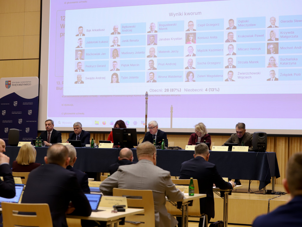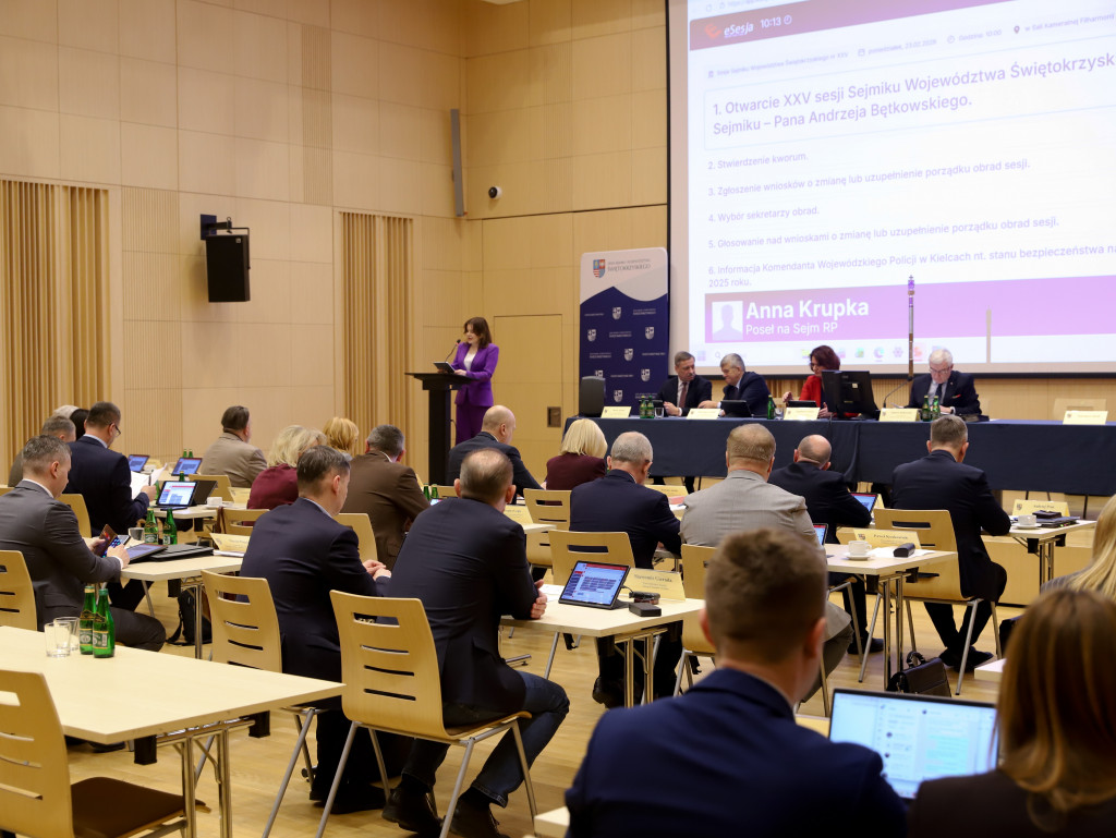 W poniedziałek 23 lutego br. w siedzibie Filharmonii Świętokrzyskiej w Kielcach odbyła się XXV sesja Sejmiku Województwa Świętokrzyskiego, którą poprowadził przewodniczący Andrzej Bętkowski. Radni przegłosowali uchwały m.in. w sprawie zasad udzielania dotacji z budżetu samorządu województwa na prace konserwatorskie, restauratorskie lub roboty budowlane przy zabytkach, oraz w sprawie zmian w budżecie województwa na 2026 rok.