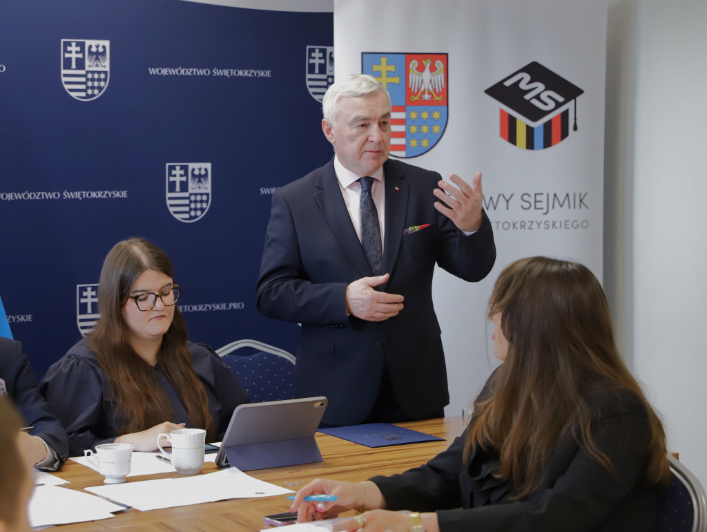 Członek Zarządu Andrzej Pruś podkreślił: – Doradzanie Wam jest przyjemnością. Obserwuję, jak pięknie budujecie swój kapitał i społeczne kompetencje. Jestem przekonany, że dzięki doświadczeniu, które tu zdobywacie, w przyszłości wielu z Was z powodzeniem zasiądzie w ławach Sejmiku Województwa Świętokrzyskiego jako doświadczeni samorządowcy.