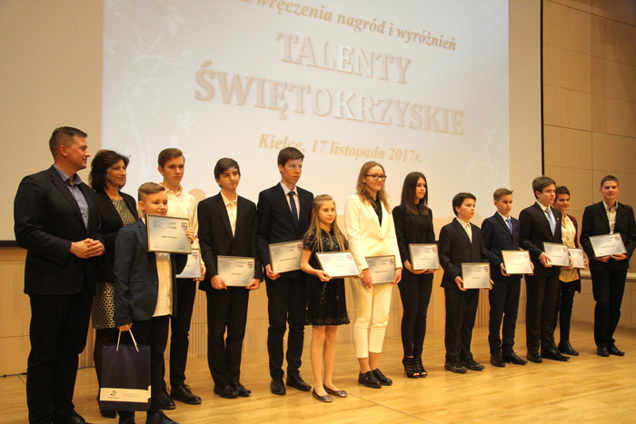 Laureaci krajowych i międzynarodowych konkursów m.in. w dziedzinie matematyki i języków, uzdolnieni muzycy, tancerze, młodzi naukowcy z województwa świętokrzyskiego zostali uhonorowani nagrodami i wyróżnieniami podczas uroczystej gali “Talenty Świętokrzyskie”, która 17 listopada odbyła się w Filharmonii Świętokrzyskiej. Gratulacje młodym, uzdolnionym mieszkańcom regionu składali: przewodniczący Sejmiku Województwa Świętokrzyskiego Arkadiusz Bąk i Agata Binkowska, członek Zarządu Województwa. – Jesteście naszymi świętokrzyskimi perłami i diamentami, wykorzystujcie i rozwijajcie swój talent każdego dnia, rozwijajcie Świętokrzyskie – mówił zwracając się do laureatów przewodniczący Sejmiku Arkadiusz Bąk.