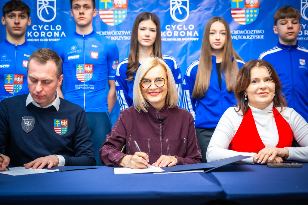 Młodzi, utalentowani kieleccy cykliści będą dalej promować walory województwa świętokrzyskiego podczas kolarskich wyścigów i treningów. Marszałek województwa Renata Janik oraz przedstawiciele Miejskiego Klubu Sportowego Cyclo Korona: prezes Zarządu Łukasz Dudała i wiceprezes Tomasz Brożyna podpisali kolejną umowę na promowanie województwa świętokrzyskiego poprzez tzw. marketing sportowy. Umowa obowiązywać będzie do końca 2026 r. W wydarzeniu wzięli udział także radny Sejmiku Kazimierz Mądzik oraz poseł RP Anna Krupka.