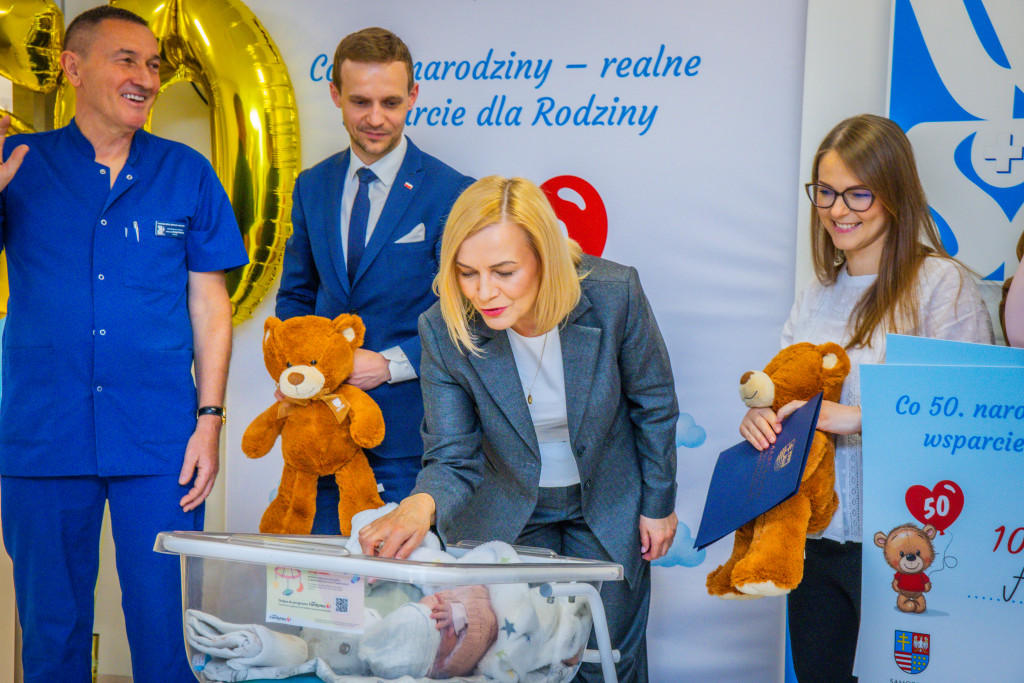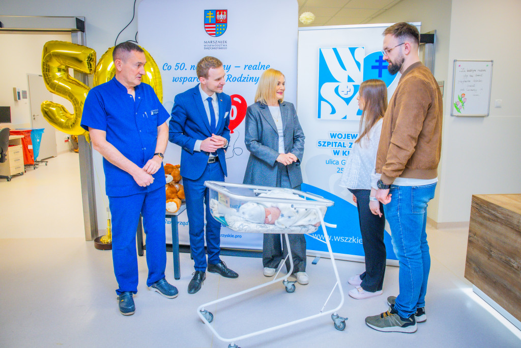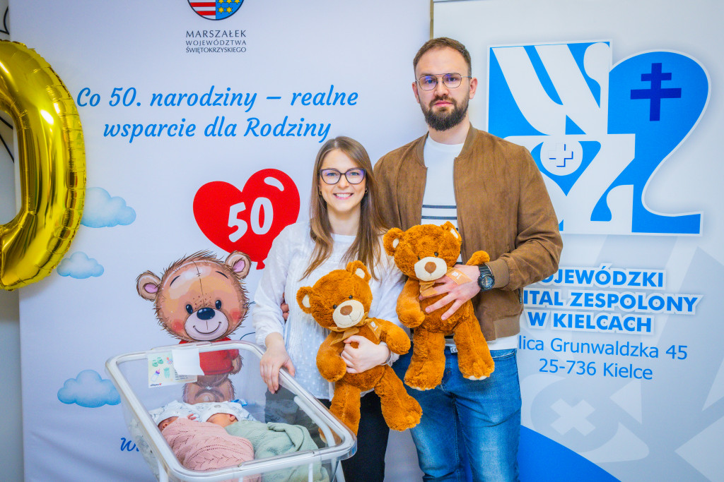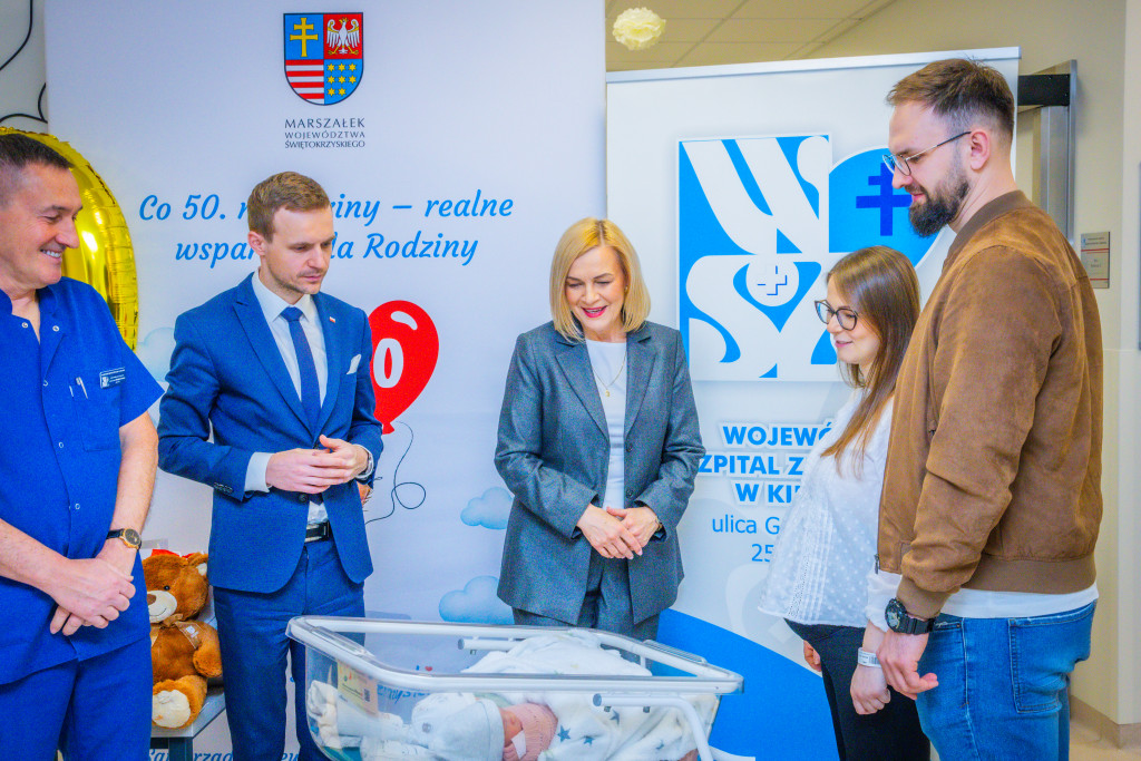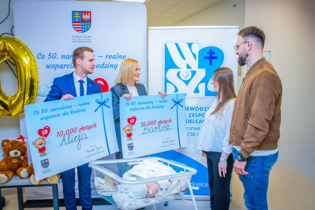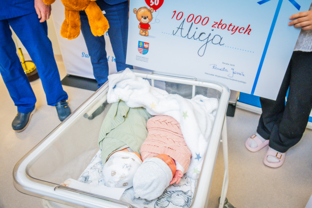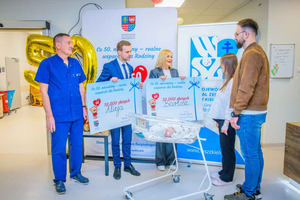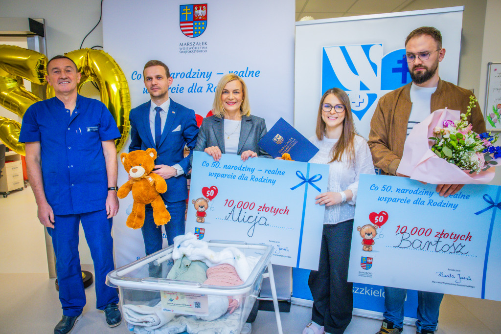Statystyki narodzin w Wojewódzkim Szpitalu Zespolonym w Kielcach (WSzZ) wykazują stałą tendencję wzrostową. Zaledwie dwa tygodnie po powitaniu 450. dziecka świętujemy narodziny 500. malucha w 2026 roku – w tym przypadku bliźniaków: Alicji i Bartosza. Zgodnie z regulaminem programu „Co 50. narodziny – realne wsparcie dla Rodzin”, szczęśliwi rodzice z gminy Piekoszów otrzymali z rąk marszałek Renaty Janik oraz dyrektora szpitala Marcina Martyniaka symboliczne czeki na bezzwrotną pomoc finansową w wysokości 10 tys. zł. Dzisiejszy jubileusz stał się także momentem, od którego „Świętokrzyska Wyprawka dla Malucha” będzie przekazywana rodzicom z dodatkowymi elementami wyposażenia. W wydarzeniu uczestniczył także Grzegorz Świercz, kierownik Kliniki Położnictwa i Ginekologii w WSzZ.