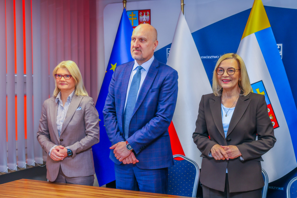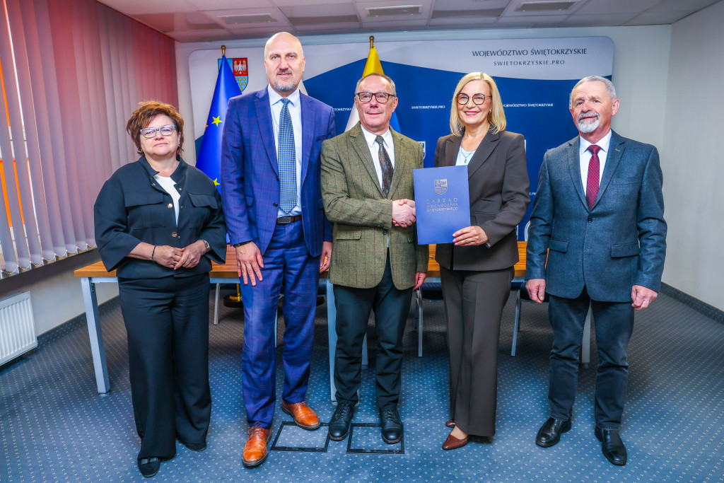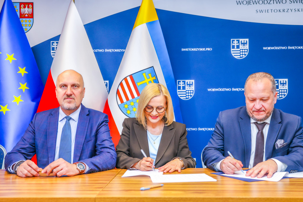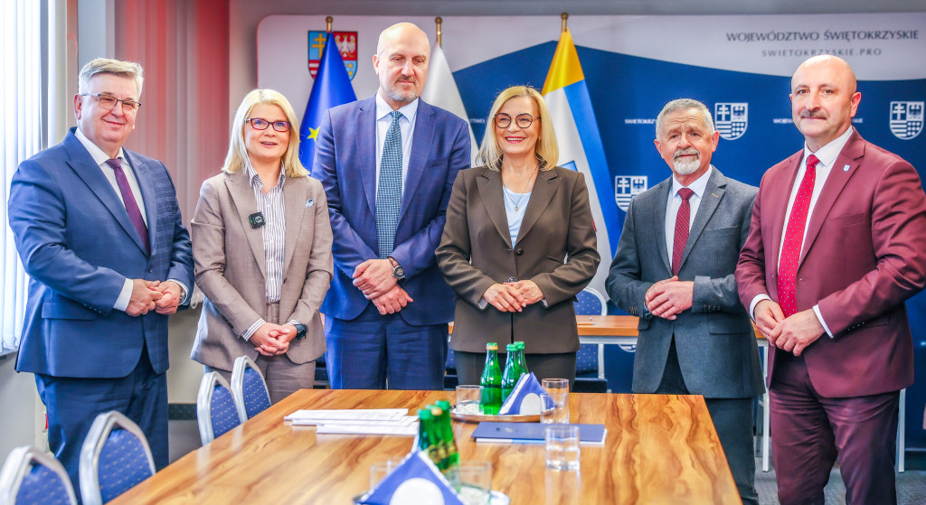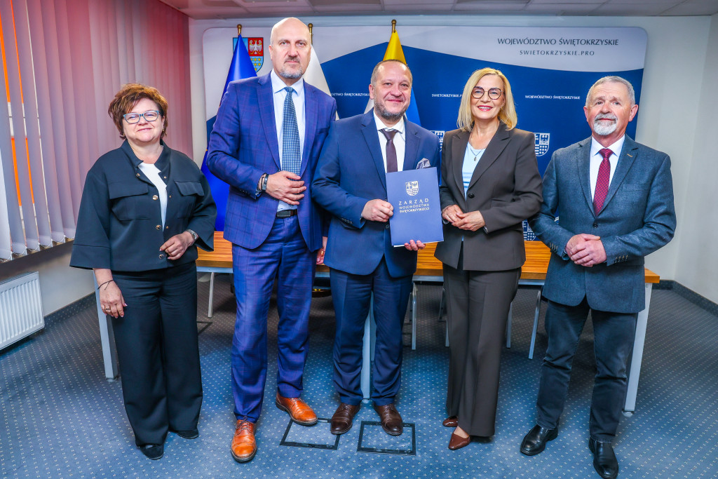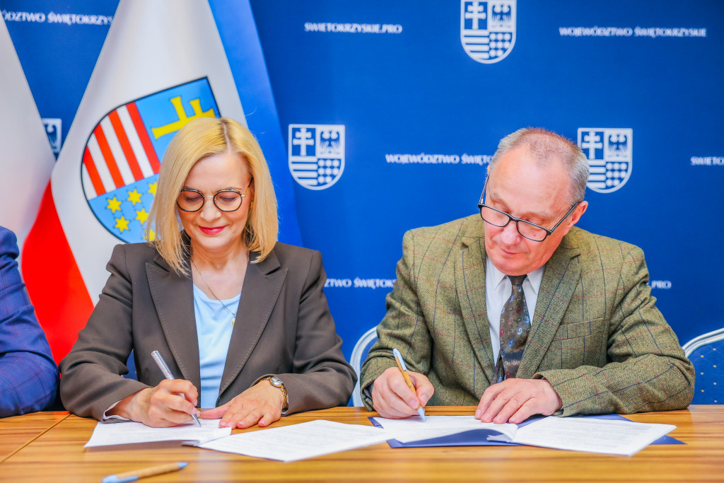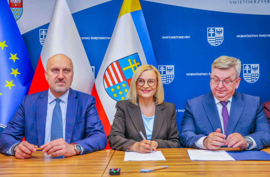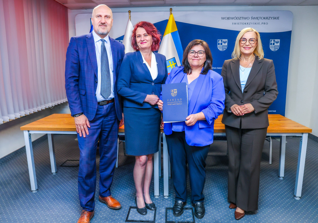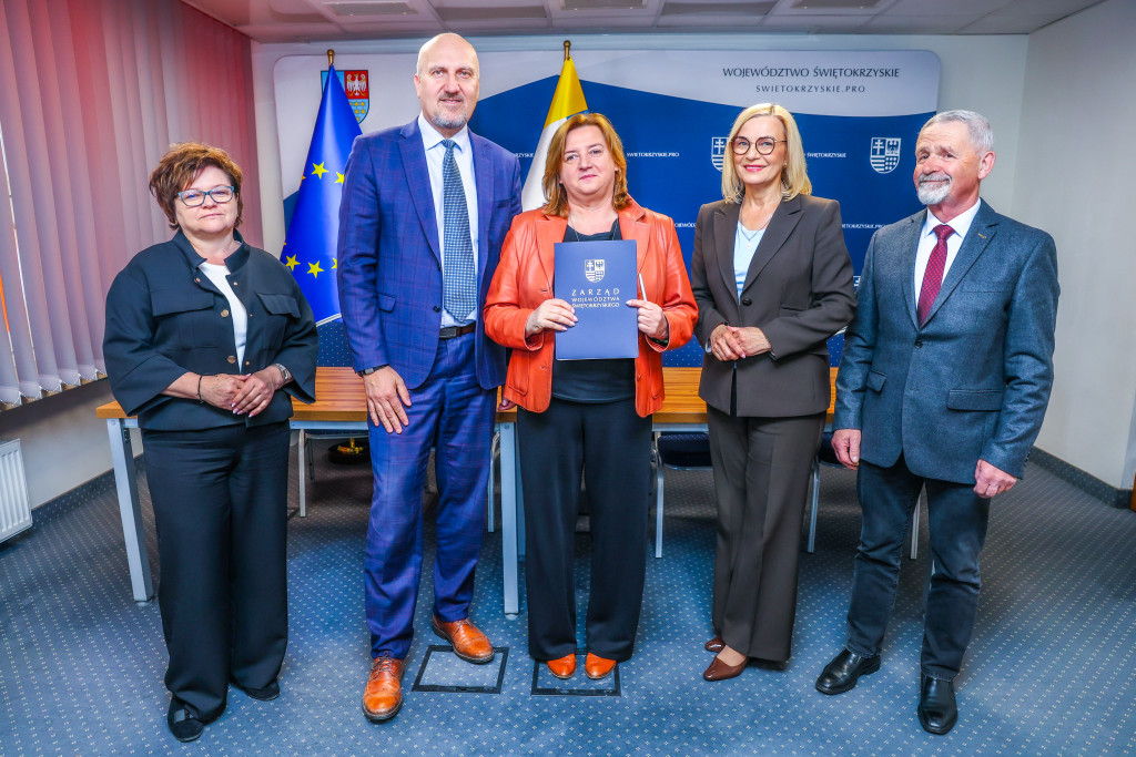Marszałek Renata Janik oraz wicemarszałek Grzegorz Socha podpisali dzisiaj umowy na 5 projektów, które dotyczą podnoszenia jakości kształcenia w świętokrzyskich technikach. Dzięki nim 455 uczniów zyska płatne staże oraz szkolenia, a 13 nauczycieli podniesie swoje kwalifikacje na studiach podyplomowych. Projekty będą realizowane w 7 szkołach, w gminach: Kielce (3 placówki), Ostrowiec Świętokrzyski, Bodzentyn, Chmielnik, Chęciny. Dzięki środkom z „Fundusze Europejskie dla Świętokrzyskiego 2021-2027” szkoły będą mogły organizować specjalistyczne zajęcia i kursy zawodowe, dopasowane do kierunków kształcenia, których zakres wykracza poza podstawowy program edukacji młodzieży. W wydarzeniu wzięła udział także wiceprzewodnicząca Sejmiku Magdalena Zieleń, radny i przewodniczący Komisji Zdrowia, Polityki Społecznej i Spraw Rodziny Kazimierz Mądzik oraz dyrektor Departamentu Wdrażania Europejskiego Funduszu Społecznego Katarzyna Kubicka. Starostwo Powiatowe w Kielcach reprezentowali m.in. starosta Powiatu Kieleckiego Tomasz Pleban oraz członek Zarządu Powiatu Kieleckiego Mariusz Ściana.