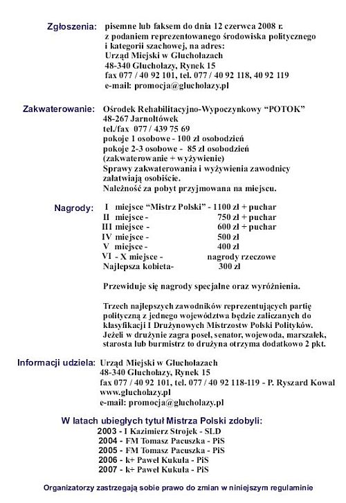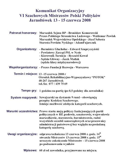 Impreza organizowana jest już po raz szósty przez Burmistrza Głuchołaz. VI Szachowe Mistrzostwa Polski Polityków odbywać się będą w dniach 13-15 czerwca w ośrodku w Jarnołtówku k. Głuchołaz.