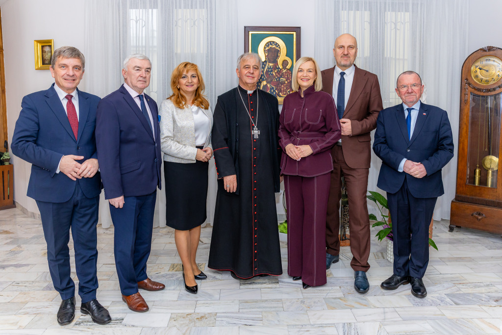 Marszałek Województwa Świętokrzyskiego Renata Janik wraz z przewodniczącym Sejmiku Województwa Świętokrzyskiego Andrzejem Bętkowskim, oraz Wicemarszałkami Grzegorzem Sochą i Markiem Bogusławskim, a także członkami Zarządu Województwa Anitą Koniusz i Andrzejem Prusiem złożyli dziś wizytę biskupowi kieleckiemu Janowi Piotrowskiemu. Podczas spotkania samorządowcy przekazali duchownemu serdeczne życzenia świąteczne oraz imieninowe, wyrażając jednocześnie słowa szacunku i podziękowania za jego posługę oraz zaangażowanie na rzecz lokalnej społeczności.