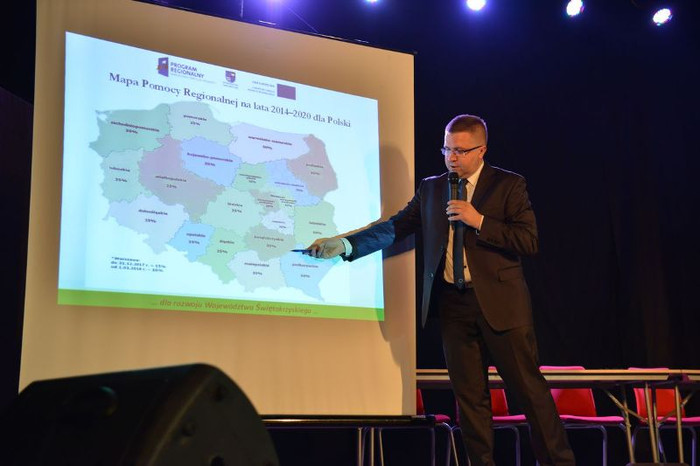 Spotkanie pn. „Samorząd i przedsiębiorcy – razem możemy więcej” odbywa się na terenie Centrum Rekreacji MOSiR. Grzegorz Orawie, dyrektor Departamentu Polityki Regionalnej Urzędu Marszałkowskiego Województwa Świętokrzyskiego zaprezentował Regionalny Program Operacyjny pod kątem wsparcia gospodarki w perspektywie finansowej na lata 2014-2020 oraz opowiedział o partnerstwie publiczno-prywatnym, jako efektywnej formie realizacji zadań publicznych.