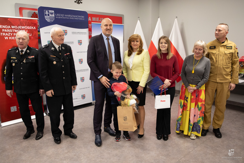Nagrody wręczyli: wicemarszałek Grzegorz Socha, Anita Koniusz, członek Zarządu Województwa Świętokrzyskiego, st. bryg. Marcin Charuba – Świętokrzyski Komendant Wojewódzkiego PSP oraz dh Krzysztof Gajewski – Wiceprezes Zarządu Oddziału Wojewódzkiego Związku OSP RP woj. świętokrzyskiego.
