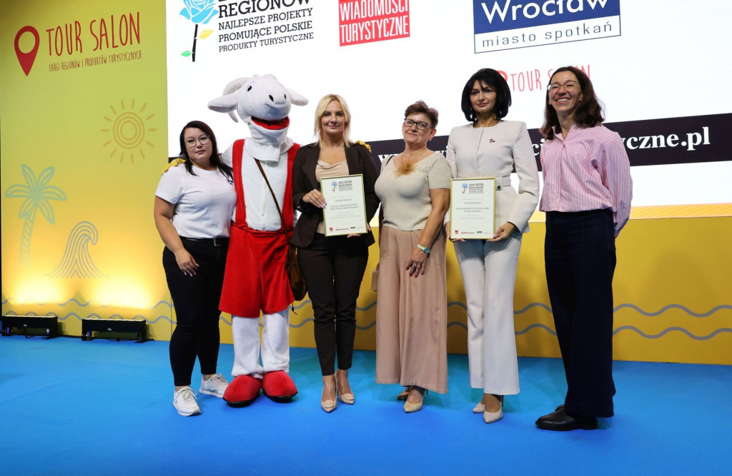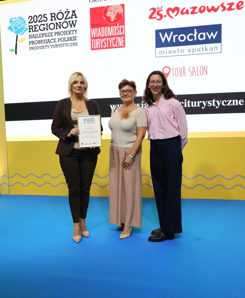 Województwo Świętokrzyskie zostało docenione podczas Targów Regionów i Produktów Turystycznych TOUR SALON 2025 w Poznaniu. W prestiżowym konkursie „Róża Regionów”, organizowanym przez redakcję „Wiadomości Turystycznych”, nasz region zdobył wyróżnienie za kampanię promującą turystykę kajakową Ponidzia. Wyróżnienie w imieniu Województwa Świętokrzyskiego wyróżnienie odebrały przedstawicielki Departamentu Edukacji, Kultury i Sportu, Oddziału Turystyki – Dorota Łukomska, Zastępca Dyrektora Departamentu, oraz Agnieszka Pabis, główny specjalista Oddziału Turystyki.