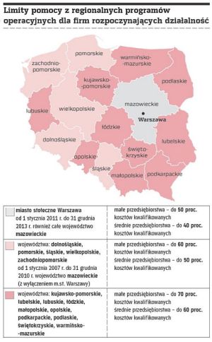 Maksymalna wysokość wsparcia jest uzależniona od wielkości przedsiębiorstwa i lokalizacji inwestycji. W różnych województwach przewidziano różne limity wsparcia (patrz: mapka i tabelka).