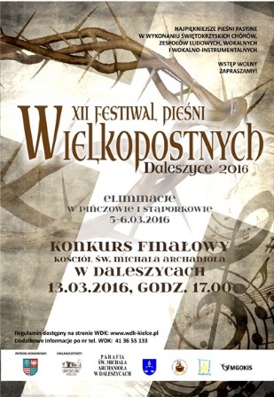 Chóry, zespoły ludowe, zespoły wokalne i wokalno-instrumentalne wykonujące utwory pasyjne, do 23 lutego mogą nadsyłać aplikacje zgłoszeniowe do udziału w XII Festiwalu Pieśni Wielkopostnych. Po eliminacjach w Pińczowie i Stąporkowie specjalnie powołana Rada Artystyczna wyłoni najlepsze grupy, które wezmą udział w koncercie finałowym w Daleszycach. Honorowy patronat nad festiwalem objął marszałek województwa świętokrzyskiego, Adam Jarubas.