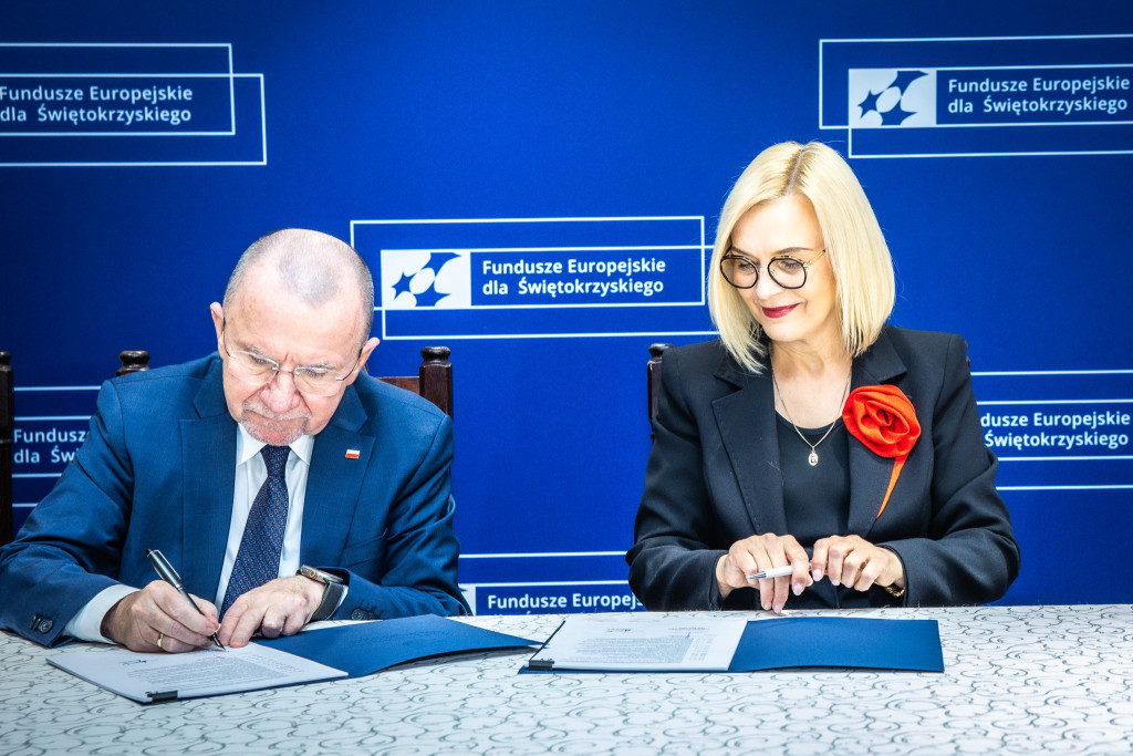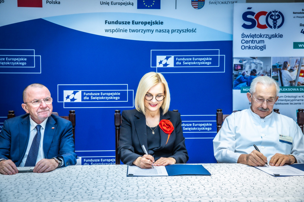 Przy Świętokrzyskim Centrum Onkologii w Kielcach powstanie jedno z najnowocześniejszych centrów badań molekularnych w Polsce! Dla pacjentów oznacza to szybszą i dokładniejszą diagnostykę, dostęp do innowacyjnych badań klinicznych, tańsze leki oraz szansę na leczenie dopasowane do ich potrzeb. Marszałek Renata Janik, wicemarszałek Marek Bogusławski oraz dyrektor ŚCO prof. Stanisław Góźdź podpisali dziś umowę na dofinansowanie budowy i wyposażenia Centrum Badań Molekularnych. – To jedna z najważniejszych inwestycji tej kadencji, dzięki której w regionie świętokrzyskim będą tworzone terapie przyszłości – podkreśliła marszałek Renata Janik. Łączna wartość inwestycji to ponad 155 mln zł, z czego przeszło 113 mln zł stanowi dofinansowanie z Europejskiego Funduszu Rozwoju Regionalnego. W podpisaniu umowy uczestniczyli: wiceprzewodniczący Sejmiku Województwa Świętokrzyskiego Magdalena Zieleń i Mieczysław Gębski, przewodniczący Komisji Zdrowia, Polityki Społecznej i Spraw Rodziny Sejmiku Województwa Kazimierz Mądzik, z-ca dyrektora ds. Klinicznych ŚCO dr hab. n.med. Jolanta Smok-Kalwat, dr hab. n. med. Artur Kowalik, prof. UJK kierujący Zakładem Diagnostyki Molekularnej ŚCO.