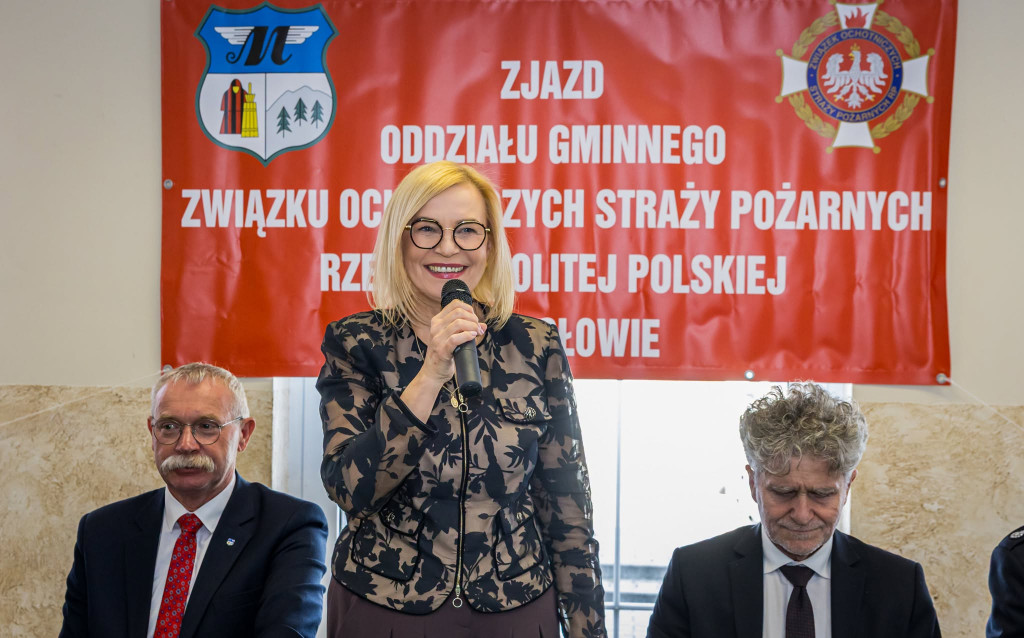 Renata Janik Marszałek Województwa Świętokrzyskiego przekazała przedstawicielom jednostek OSP z gminy Masłów serdeczne podziękowania za ofiarną służbę, życzyła bezpiecznych powrotów z każdej akcji i kolejnych lat owocnej działalności